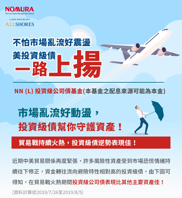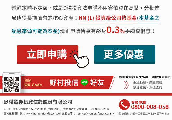 本資料係整理分析各方面資訊之結果,純屬參考性質,本公司不作任何保證或承諾,請勿將本內容視為對個別投資人做基金買賣或其他任何投資之建議或要約。本公司已力求其中資訊之正確與完整,惟不保證本報告絕對正確無誤。未經授權不得複製、修改或散發引用。「野村投資理財網」為野村證券投資信託股份有限公司(以下簡稱野村投信)在台灣之入口網站,基金交易服務由野村投信提供。本網站之所有版權、著作權及專利權,均屬於野村投信所有。非經書面授權,不得轉貼、節錄或轉載於任何形式媒體。野村投信已就「D檔投資法」之圖樣及文字取得商標權(經濟部智慧財產局商標註冊號數第01655124號),仿冒必究。(AMK01-190800063)